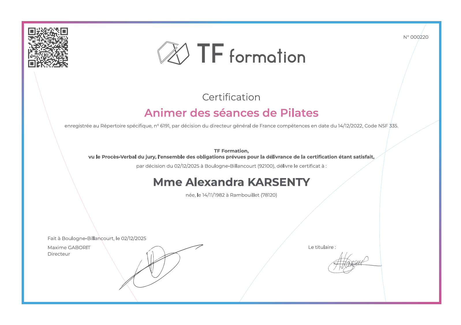 Après le Matwork niveau 1 et 2, je viens de recevoir ma Certification France Compétences : Animer des séances de Pilates en Décembre 2025!