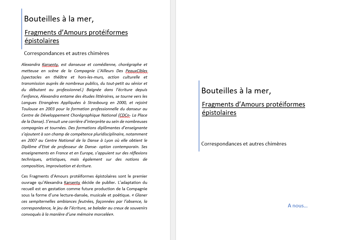 - L'autre projet est une forme légère et transportable de lectures dansées poétiques et musicales pour un public participatif dès 14 ans. Bouteilles à la Mer, Fragments d'Amour Protéiformes épistolaires